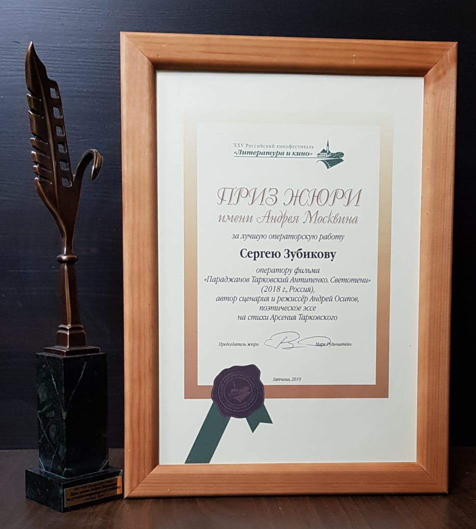 На юбилейном 25 м Фестивале Литературы и Кино в Гатчине, наш коллега и товарищ Сергей Зубиков получил приз имени Андрея Москвина за картину «Параджанов, Тарковский, Антипенко». Фильм воспоминание о встречах с режиссерами из уст замечательного кинооператора Александра Антипенко. Поэтические строки Арсения Тарковского небесным образом существуют в изображении, превращая реальность в музыку и создавая неповторимую атмосферу картин Андрея Арсениевича. Решение жюри было единогласным. Поздравляем Сергея!