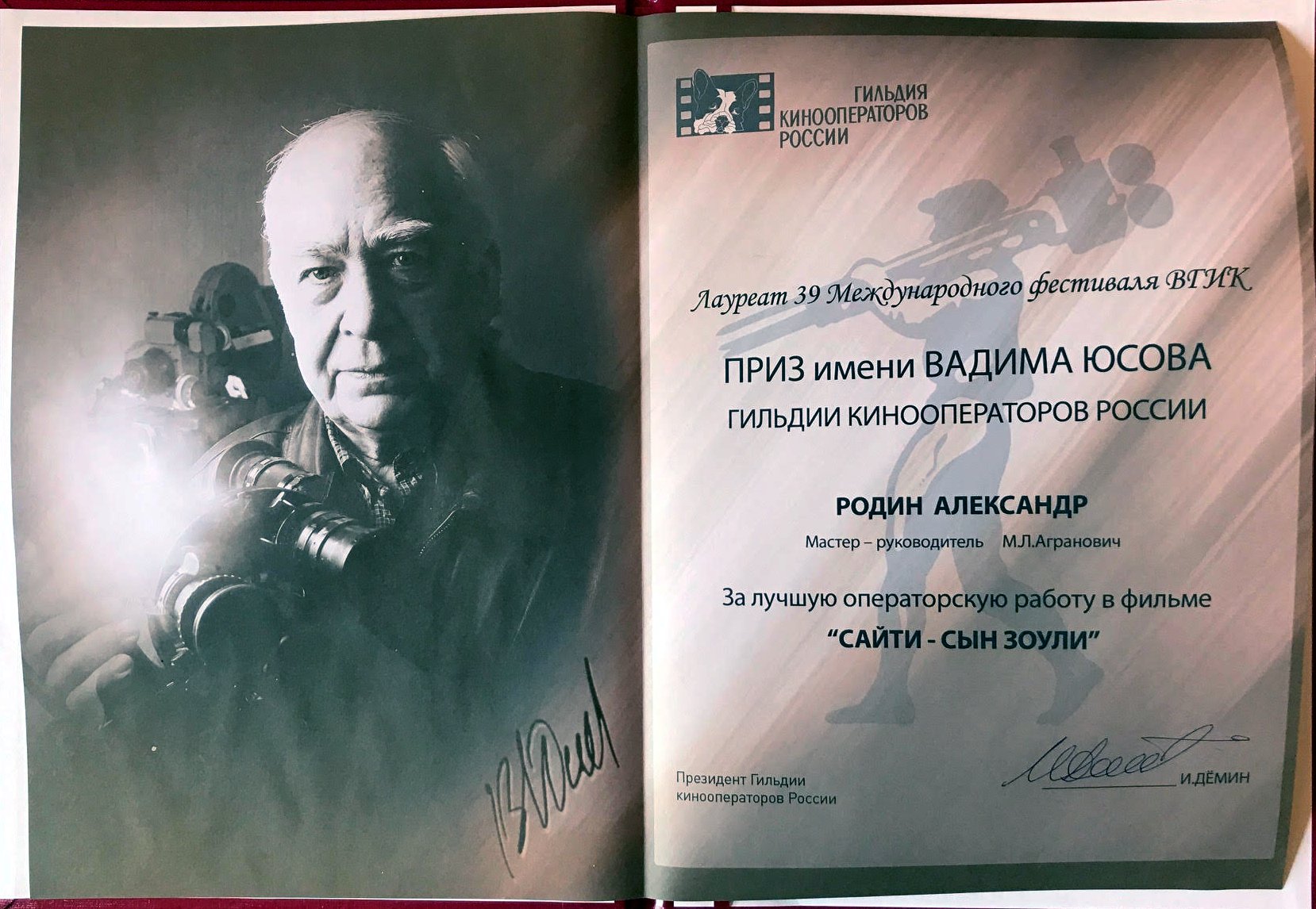 Приз получил оператор Александр Родин за работу над фильмом «Сайти — сын Зоули», мастер руководитель мастерской Михаил Агранович.