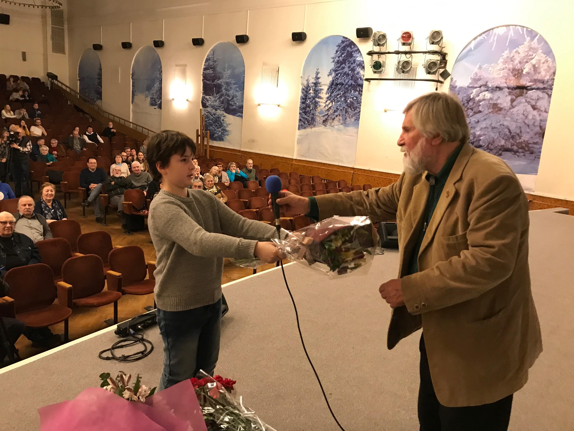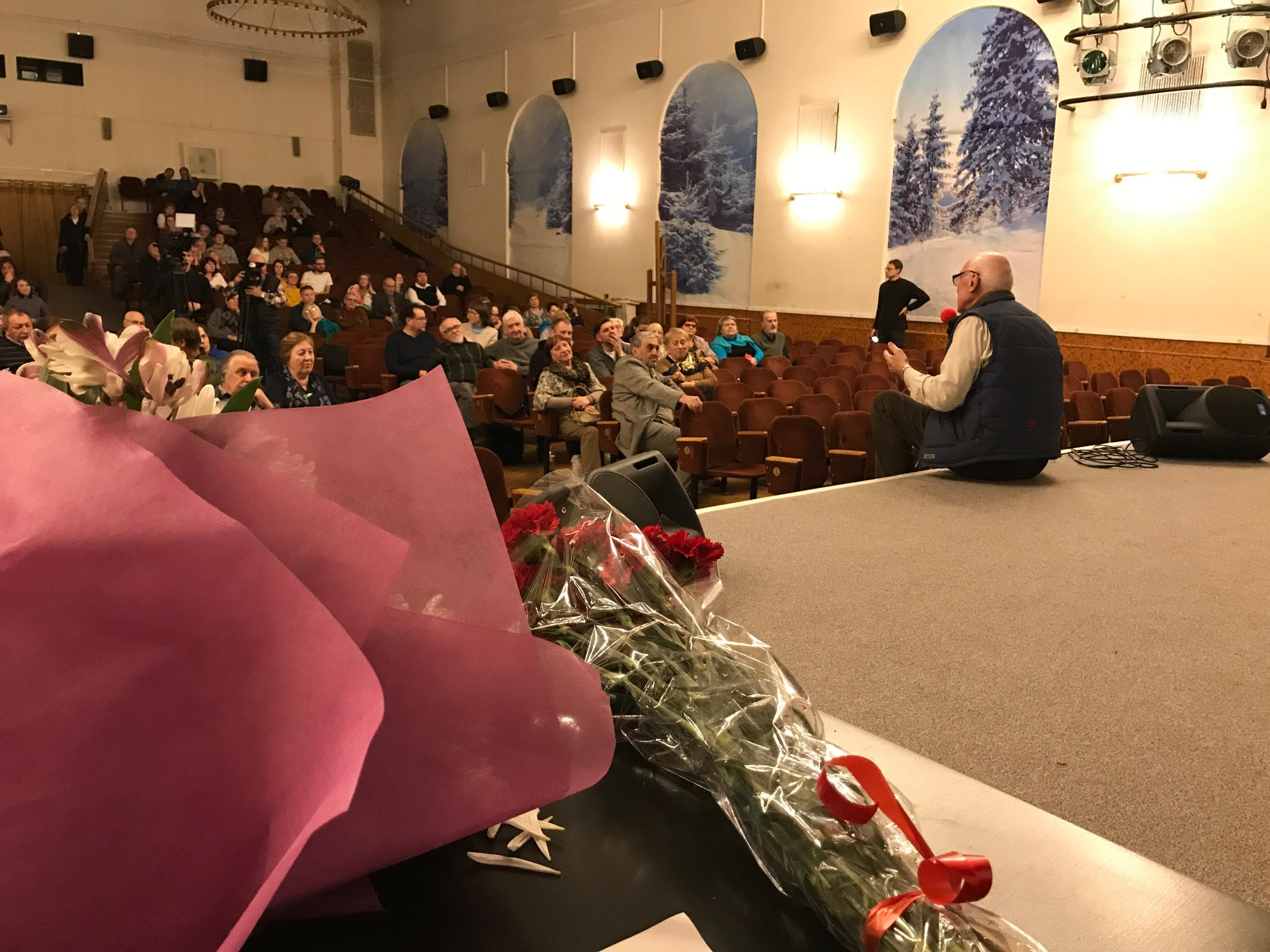 Вечер вел президент Гильдии Кинооператоров Дёмин Илья. Все началось с дружественного поздравления от друзей и коллег по «цеху», вручением цветов, аплодисментами и криками «браво». В том числе цветы вручали и внуки юбиляра.